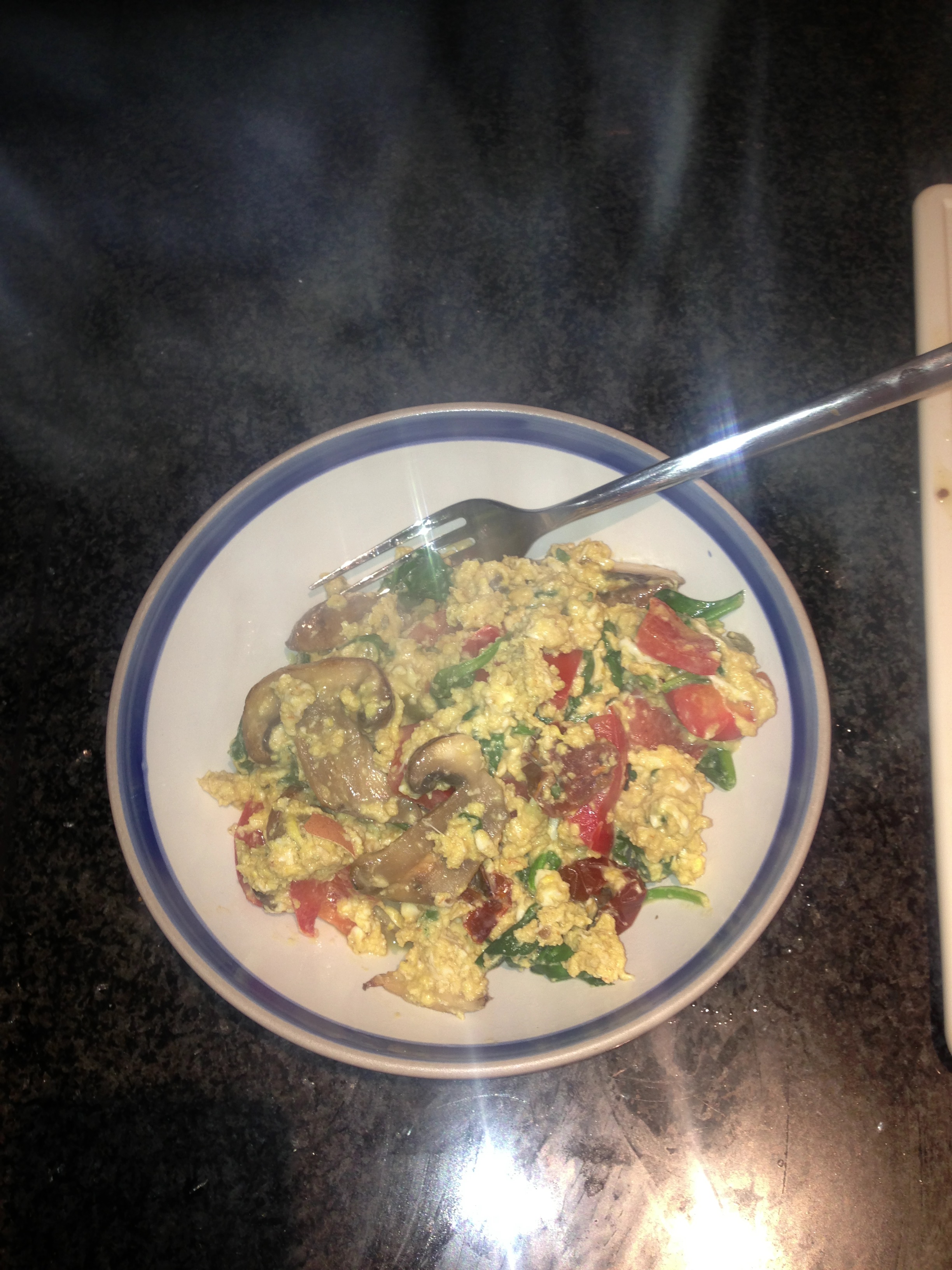 Tip the eggs on top of the Turkey – you can add tomatoes and mushrooms if you have an extra 2 minutes, I usually don’t
