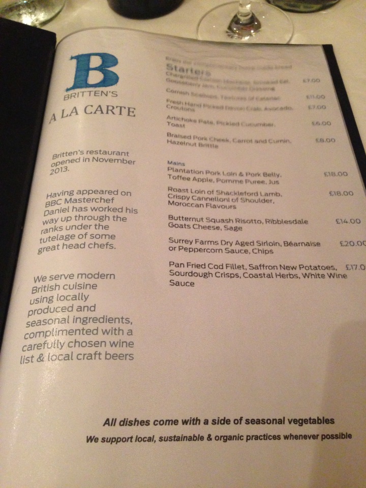 I have eaten out way too much this week and last night (Saturday) was a great end to a good week of dining out. Bradley and I drove to Guildford for an early table at Brittens and had a fab time.